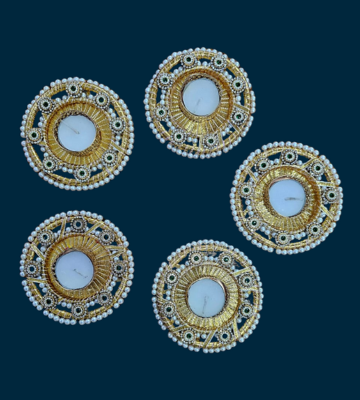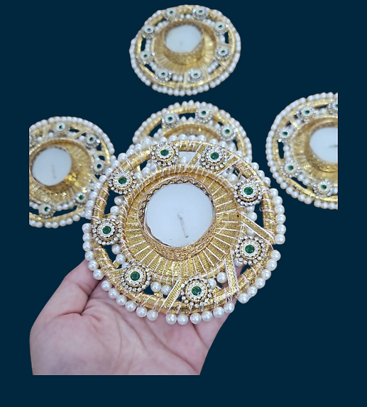 Elegant traditional tealight holders adorned with gold detailing, pearls, and green embellishments — perfect for festive décor and celebrations.- Product Code: SD-HDR-001