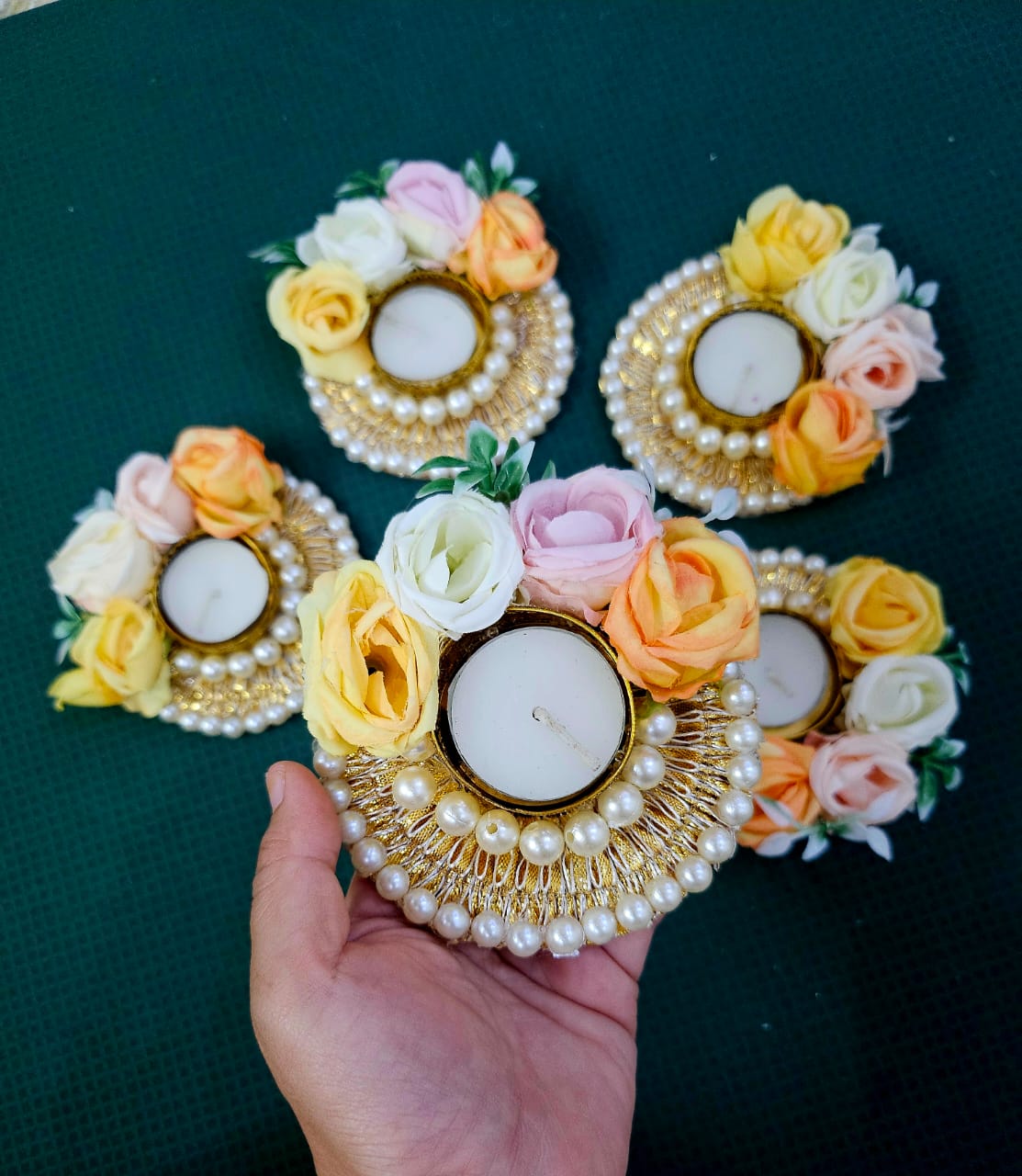 Light up your festivities with these elegant floral tealight holders 🌸✨ Beautifully adorned with pearls and pastel roses, they bring a soft, graceful glow to your décor. Perfect for Diwali, weddings, or pooja decoration — crafted with love by Shringar Dil Se. 🪔💛- Product Code: SD-HDR-022
