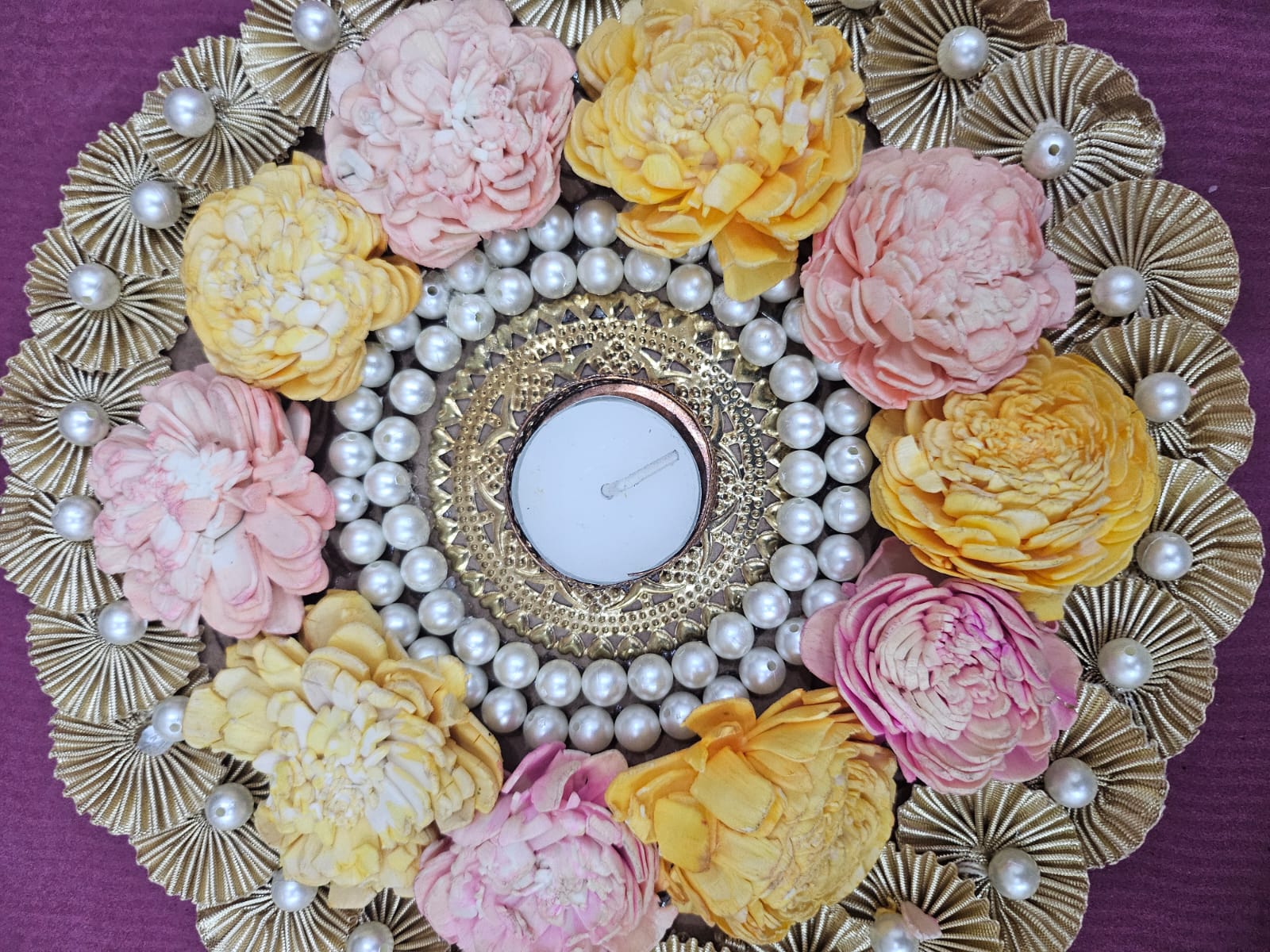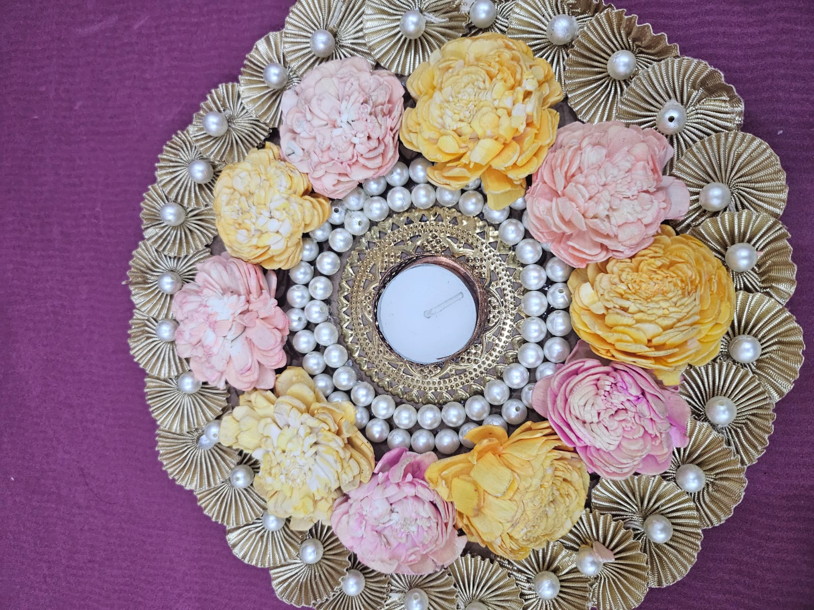 Radiate festive elegance with this stunning floral tealight platter ✨🌸 Adorned with pastel flowers, pearls, and golden detailing, it’s perfect for adding a royal glow to your Diwali décor, pooja setup, or centerpiece styling. 🪔💛- Product Code: SD-HDR-017