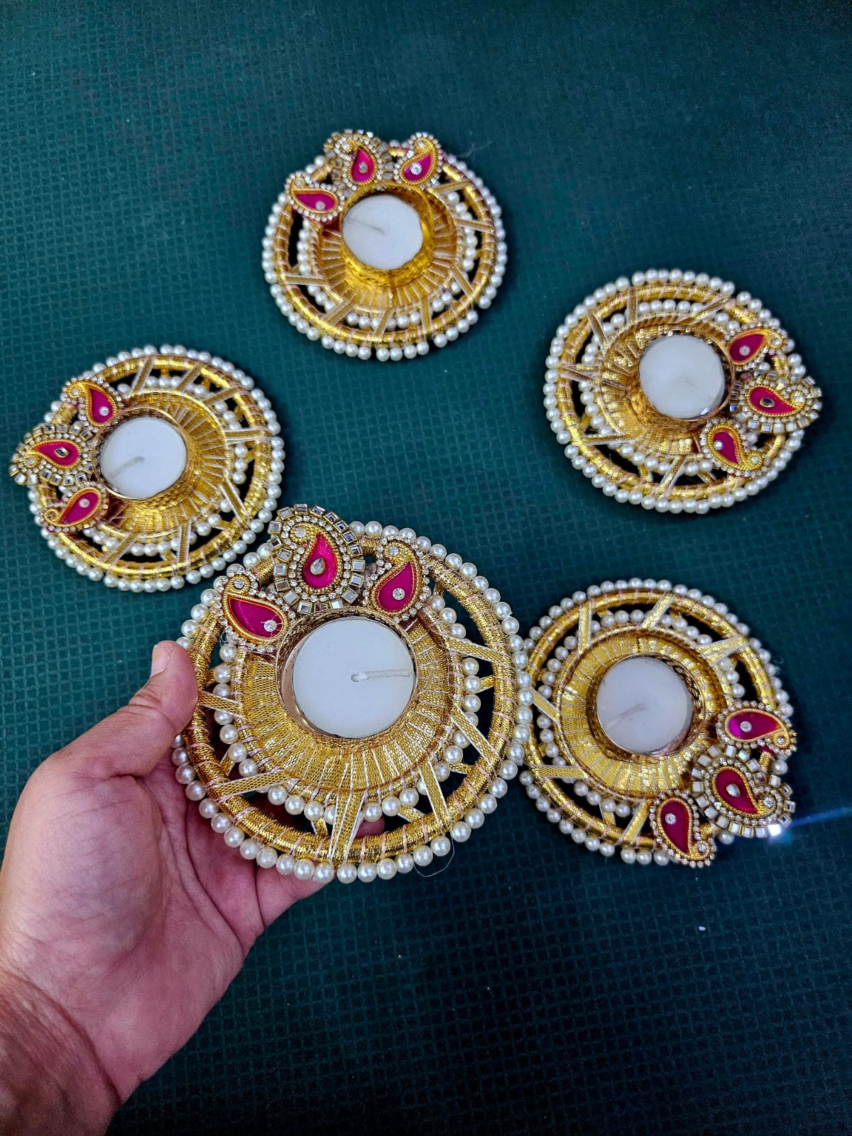 Illuminate your festivities with these stunning ambi-design tealight holders ✨💖 Embellished with pearls, golden detailing, and vibrant pink accents, they add a royal and traditional charm to your décor. Perfect for Diwali, pooja setups, and festive decorations — crafted with elegance by Shringar Dil Se. 🪔💫- Product Code: SD-HDR-023